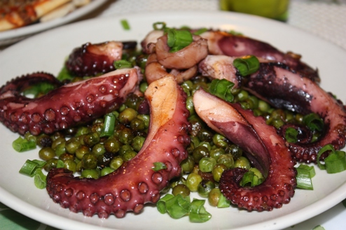 Спершу очистила від від усього зайвого (в тому числі від чорнильного мішечка). У підсолену кип’ячену воду з лавровим листком і перчиками різноманітними занурила на кілька хвилин восьминога, а далі поклала до пасерованої цибульки в сковорідку і кілька хвилин потушкувала, додавши за смаком солі і чорного перцю. Загальний час приготування – близько 15 хв. Восьминіг був готовий!