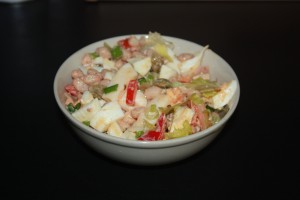 У липневий спекотний день і думати не хотілось про вмикання плити зайвий раз. Подумалось: А може б то якийсь салатик придумати?” Ситний і смачний. Мала варену квасольку, то згадався мамин салат з квасолею і шпротами. Оскільки шпротів вже не виявилось в домашніх закамарках, прийшли на допомогу дари моря (консерва з різними симпатюльками морськими – кальмарами, восьминогами, криветками та мідіями). По замовчуванню додала туди три яйця і молоденької цибульки.