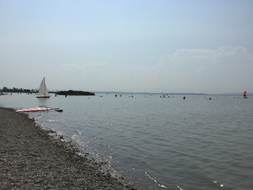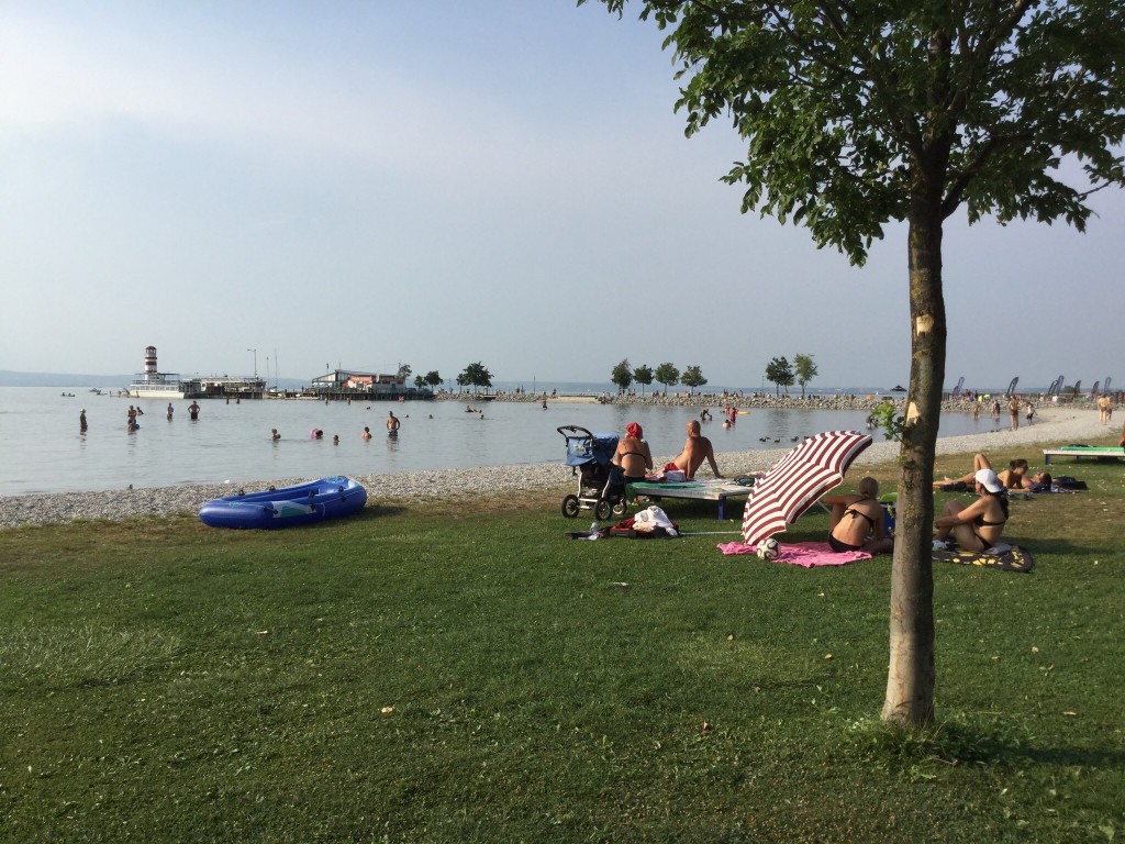 Нойзідлер –озеро, до якого година їзди від Відня. Його глибина — “жабі по коліна”, а якщо бути точнішою, то в середньому метр. Є тут пляжі з травичкою, галькою, гойдалками, на які можна потрапити за 5Є (після 17 вхід безкоштовний), різноманітні пропозиції ночівлі — готелі чи щось на зразок, а є й наметове містечко, в якому можна орендувати трейлер, а можна розміститись зі своїм наметом.